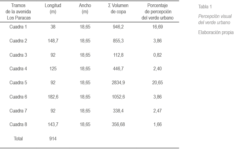 La percepción del verde urbano se definió en relación con la proporción de volumen verde. En comparación con las demás zonas del distrito, es la que cuenta con el mayor número de parques y jardines, por lo que se considera como pulmón de Ate. En este caso, se consideraron los tramos de la avenida Los Paracas, donde más del 10 % del volumen verde se encuentra solo en un 25 % de la longitud total de la avenida (véase la tabla 1). Dicho volumen verde está formado por árboles de mediano (91,2 %) y pequeño porte (8,8 %).