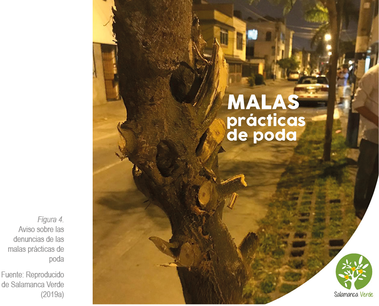 En marzo del mismo año, se alcanzó a la Municipalidad de Ate un informe técnico sobre la poda de los árboles urbanos. Las recomendaciones brindadas fueron desatendidas, pues continuaron podando los árboles sin suficiente criterio. En los siguientes meses se identificaron casos de podas antitécnicas, en las que incluso los vecinos participaban (véase la figura 4). Las denuncias se realizaron ante la Municipalidad de Ate, exigiéndose una sanción y la reposición de árboles.