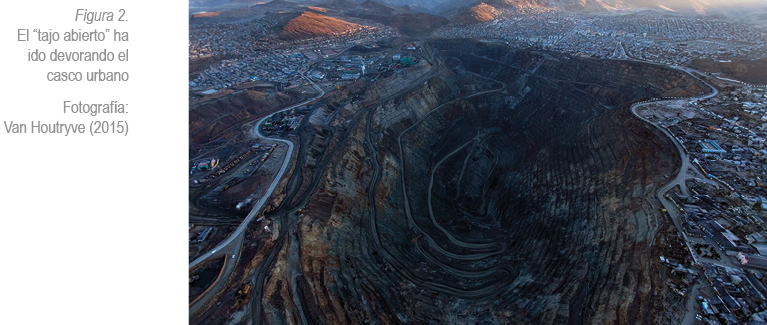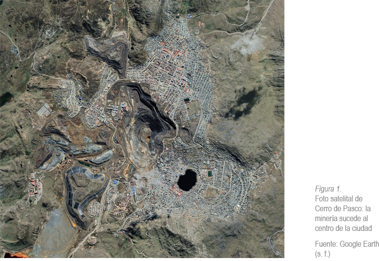 Las actividades extractivas están sometidas a presiones migratorias enormes que catalizan procesos no planificados de urbanización en los centros poblados (Thodes Miranda, 2016, p. 205). Esto da lugar a múltiples cambios territoriales como expansiones urbanas, creación de enclaves16, reasentamientos involuntarios, creación de nuevos centros poblados, declive de ciudades, etcétera (Gonzales Gavilano, 2017, p. 510). Sin embargo, el vínculo entre la actividad extractiva y el urbanismo es un campo poco explorado (De Echave et al., 2007; Gonzales Gavilano, 2017), así que con flujos migratorios masivos descontrolados la expansión física es caótica. Probablemente, el caso más emblemático de la situación descrita es la ciudad de Cerro de Pasco, capital de la región Pasco, donde décadas de expansión urbana descontrolada y explotación minera han ocasionado que la actividad extractiva suceda en plena ciudad (véase la figura 1). Es una situación virtualmente imposible de revertir, ya que, paradójicamente, la ampliación del “tajo abierto” se ha convertido también en su bonanza económica. El cierre de la mina significaría la pobreza de toda la región, argumento usado por los distintos propietarios durante la última mitad del siglo para justificar la expansión del “tajo”. Sin embargo, esta resulta en la depredación de la trama urbana y el patrimonio histórico (véase la figura 2); la ciudad debe elegir constantemente entre perder su pasado o su futuro (Vittor, 2007, párrs. 1-4).