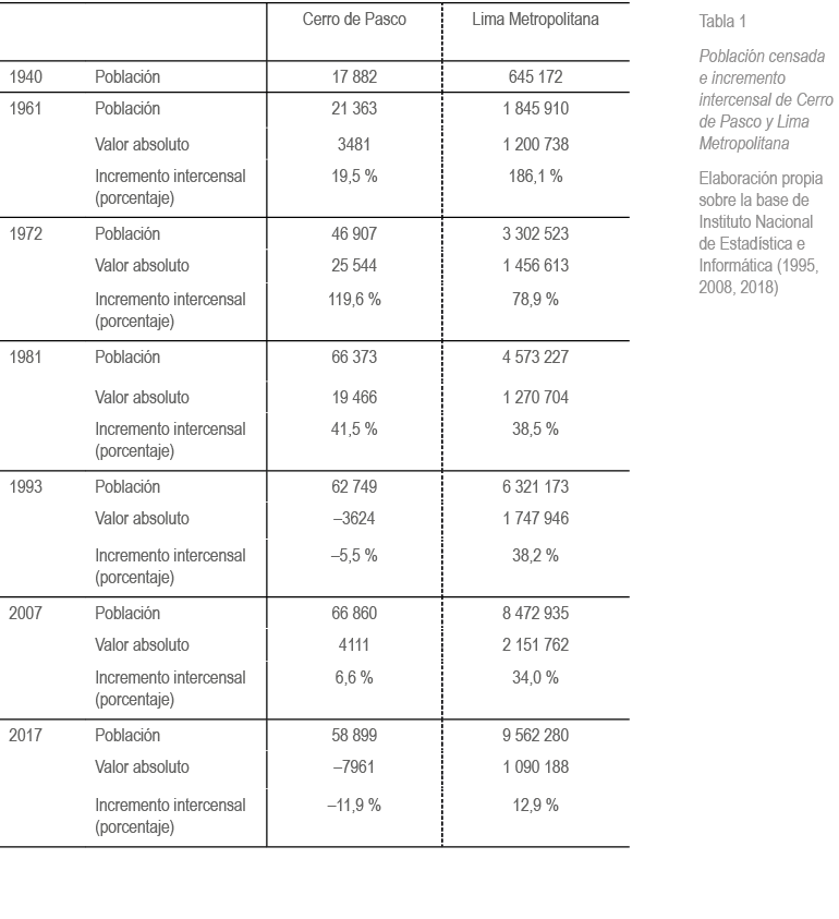 Esta migración, que cataliza la expansión física de un centro poblado, está relacionada con la explotación extractiva y es una reacción natural de las comunidades ante la promesa de desarrollo y riqueza. La tabla 1 muestra la población censada de la ciudad de Cerro de Pasco comparada con la de Lima Metropolitana, a la cual se le considera el epítome del desborde popular en el Perú. Sin embargo, se puede observar que el incremento intercensal de Cerro de Pasco superó al de Lima en dos censos, 1972 y 1981, probablemente relacionados con la continua ampliación del “tajo abierto”. Con migraciones que triplican una población en veinte años, de 21 363 en 1961 a 66 373 en 1981, y sin una visión de planificación urbana o territorial a largo plazo, no parece muy descabellado esperar un resultado como el que actualmente enfrentan los cerreños.