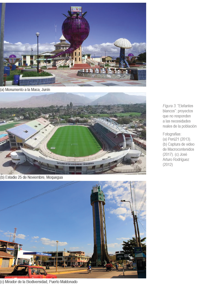 Esta “inversión sin visión” tiene como consecuencia que el 32 % del canon se ejecute sin proyecto de inversión, plan u objetivo; simplemente se gasta o desaparece por corrupción (Beteta, 2019, párr. 5). La Sociedad Nacional de Minería, Petróleo y Energía (SNMPE) cuestiona la forma en que se destinan estos fondos, que son gastados en “elefantes blancos” como piscinas en distritos sin agua, estadios con capacidad mayor a toda la población o monumentos diversos (véase la figura 3). Al no definir cuáles son las verdaderas necesidades que existen en las jurisdicciones, la mayoría de la población permanece en la pobreza (El Comercio, 2014, párrs. 4-5). Por ejemplo, en el año 2005, el 71,7 % de la población de Cerro de Pasco era considerada pobre, según el método de necesidades básicas insatisfechas (NBI)18 (Ministerio de Vivienda, Construcción y Saneamiento, 2008, p. 40). Además, sumando las constantes promesas privadas de desarrollo que nunca llegan a materializarse, los espacios habitados se marginalizan; el ser humano interactúa a diario con su medio construido y la percepción de desigualdad, sobre todo en un entorno donde se generan grandes recursos económicos, frustra continuamente las expectativas de la población local.