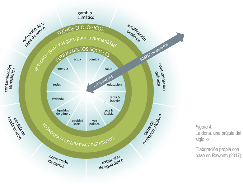 Uno de estos DT es el decrecimiento, que reclama la descolonización de la política actualmente acaparada por el economicismo que prioriza el crecimiento económico como objetivo social. En cambio, propone la creación de límites al crecimiento para controlar nuestra presión planetaria, sin que esto signifique recesión o crecimiento negativo del PBI, sino una manera de independizarnos del economicismo por sí mismo para coexistir con la capacidad de carga ecosistémica del planeta (Giacomo et al., 2018; Demaria y Latouche, 2019). Esto significa que es necesario crear un espacio seguro y justo para la humanidad entre límites de dos tipos: (1) fundamentales, para proporcionar las necesidades sociales donde todas las situaciones no abastecidas serían consideradas una deficiencia; y (2) ecológicos, para controlar nuestro impacto en el mundo, donde todas las situaciones que los transgredan serían consideradas un sobrepasamiento. Vale mencionar que estas son las bases del modelo económico de la dona (véase figura 8), propuesto por Kate Raworth en el año 2017, que Ámsterdam plantea aplicar a partir del 2020.