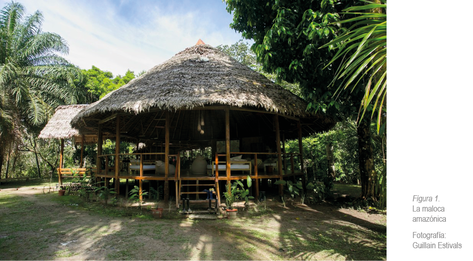En las áreas rurales de la Amazonía, tradicionalmente las casas (malocas) se encuentran relativamente espaciadas entre ellas, están hechas con madera y sobre zancos elevados a un metro del suelo, y únicamente limitadas con una baranda perimétrica. Eventualmente están cerradas por uno de sus ángulos donde se ubican los espacios húmedos, como duchas o baños. El techo está cubierto con hojas de palmera (irapay, Lepidocaryum gracile); es muy inclinado, con un desbordamiento de alrededor de 1,5 m y con una baja altura (véase la figura 1), sin cielo raso. Se hace uso de hamacas para dormir y la cocina consiste en una mesa de madera revestida con tablas y rellenada de barro.