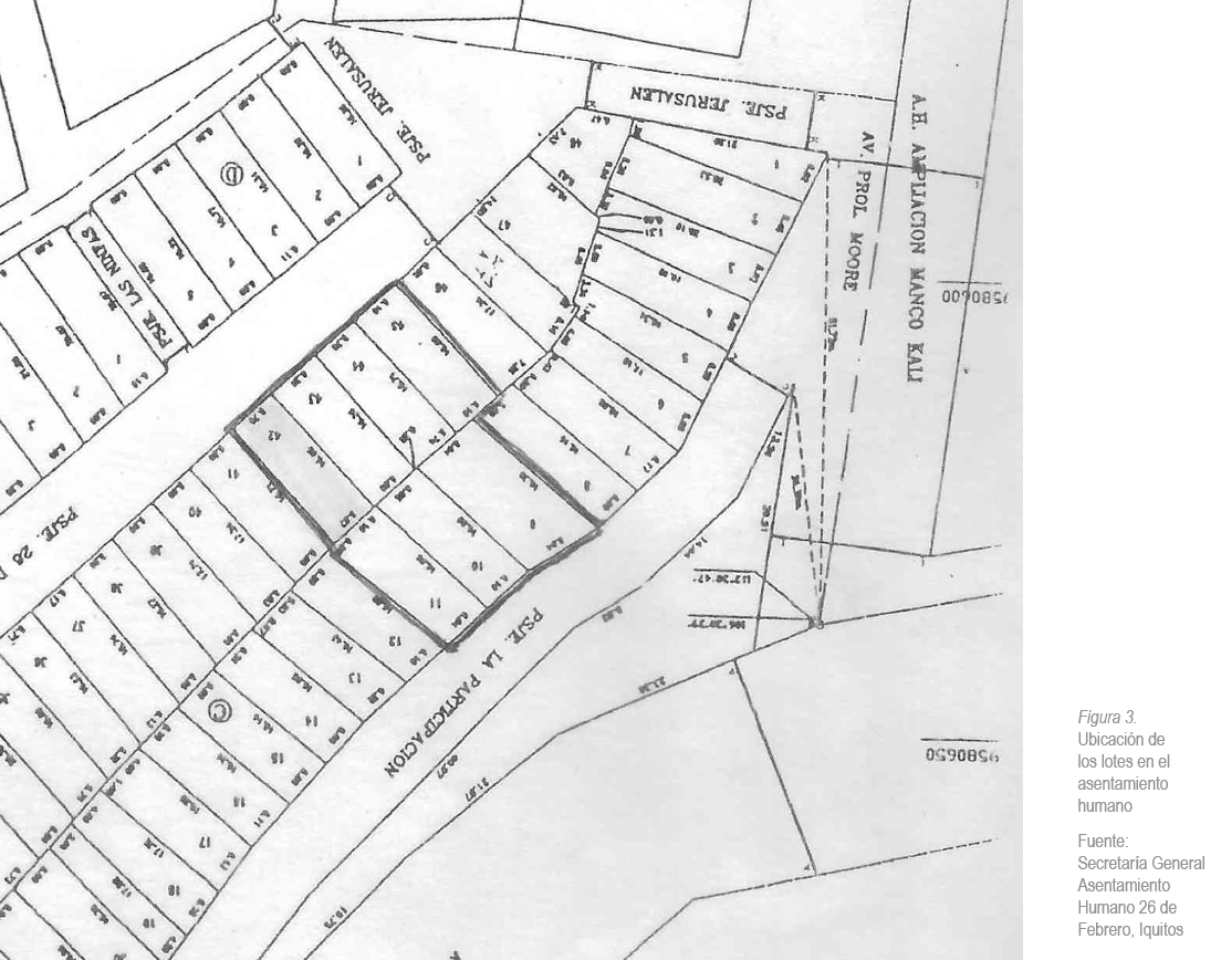 Se compraron primero cuatro lotes contiguos en el asentamiento humano (véase la figura 2), los números 9, 10, 44 y 43. El lote 9 medía 8 m × 15 m, los demás 6 m × 15 m. Se encuentran entre dos pasajes, La Participación y 26 de Febrero. El taller fue construido en el fondo de los lotes 43 y 44 con dimensiones de 4 m × 12 m, y con acceso al segundo pasaje. La casa fue construida en el medio de los cuatro lotes. Cuatro muros perimétricos provisionales, hechos con ladrillos y cemento, protegieron la obra y fueron destruidos cuando se compraron los lotes 11, 42 y 45 para aprovechar una huerta y construir una casita de guardia en el fondo del lote 42.