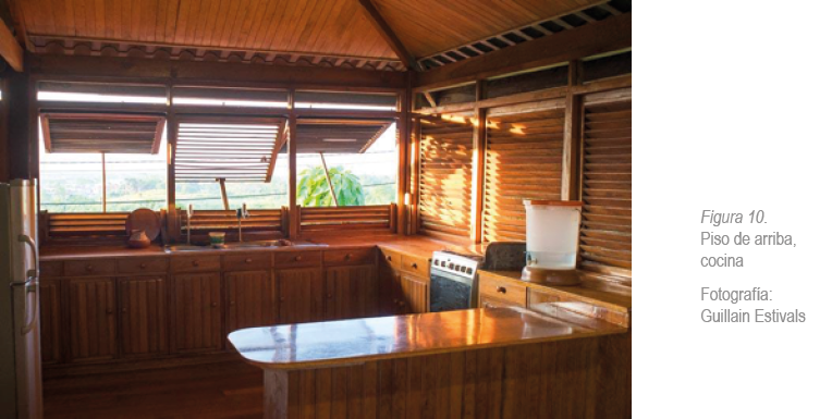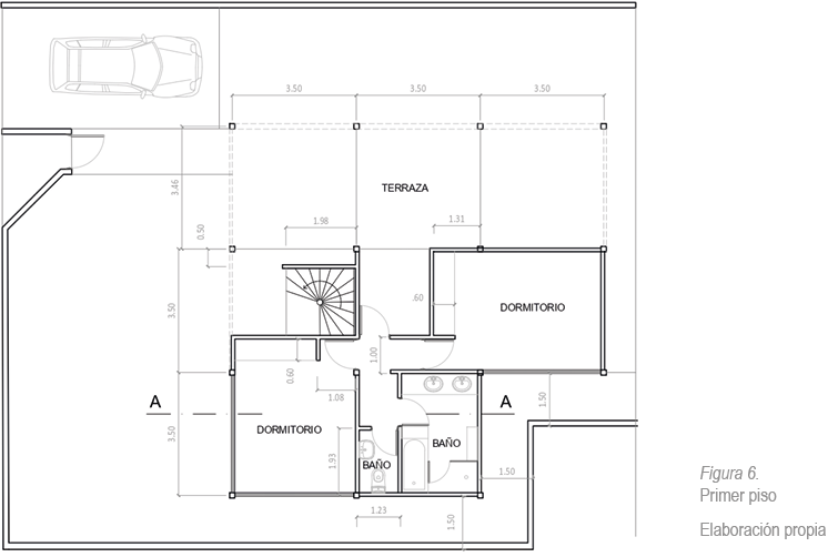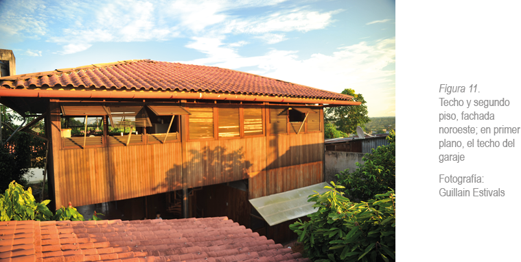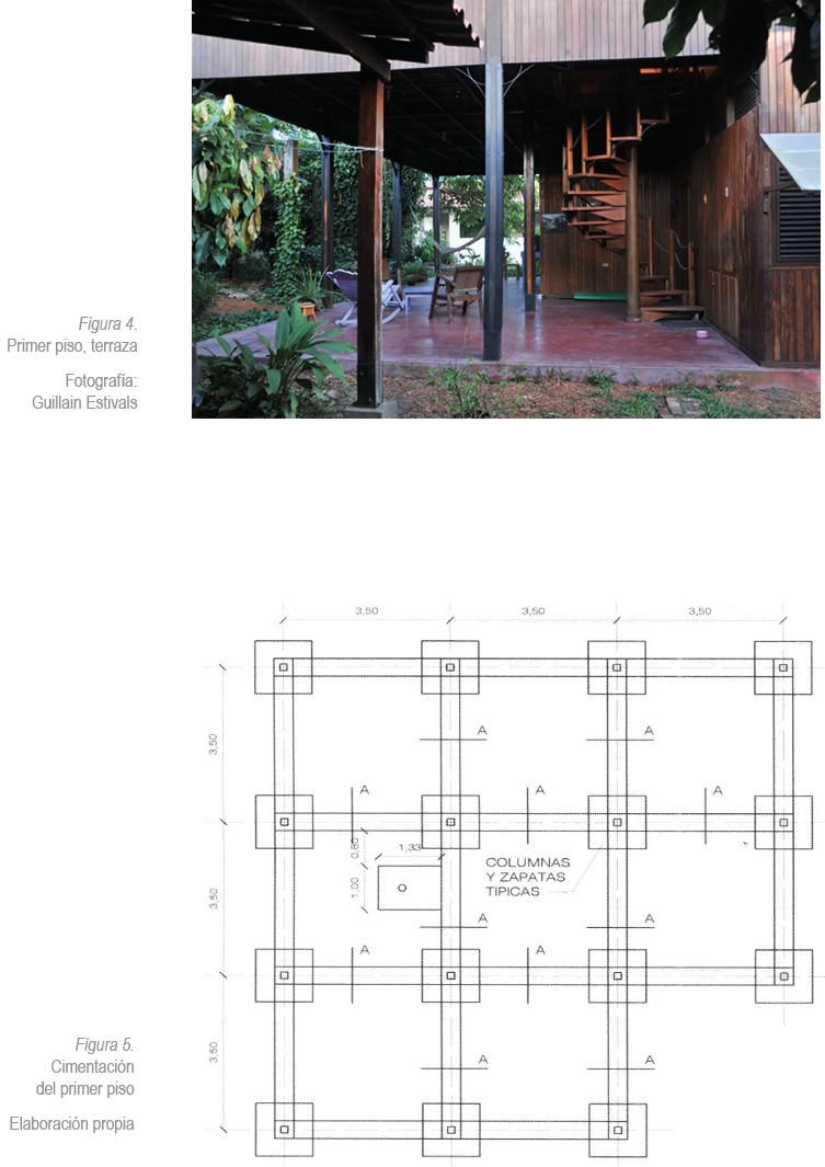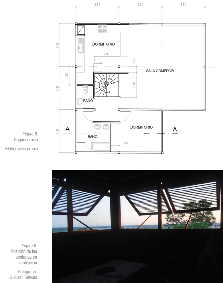 La casa, vista desde arriba, tiene la forma de una punta de flecha, lo que permite en el segundo piso tener una vista de 225°, con una pared que aísla el dormitorio y los baños. En la zona de la sala-comedor se rompe la continuidad vertical de la columna del primer piso con el fin de tener un espacio lo más libre posible; así el techo es sostenido por un cinturón de vigas (véase la figura 7).