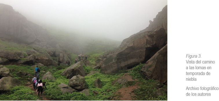Una característica de las lomas es la niebla (véase la figura 3), que surge, en primer lugar, por la condensación del vapor de agua de la atmósfera y por la presencia de partículas higroscópicas (que son microscópicas), las cuales absorben la humedad del aire y la convierten en gotas al condensarla (Corell, 2014). Las condiciones climáticas de las lomas presentan un alto índice de humedad atmosférica y temperaturas bajas. La alta humedad relativa es el resultado de la colisión de la niebla contra la ladera de las lomas, y alcanza hasta índices del 94 % (Municipalidad de Lima, 2019).