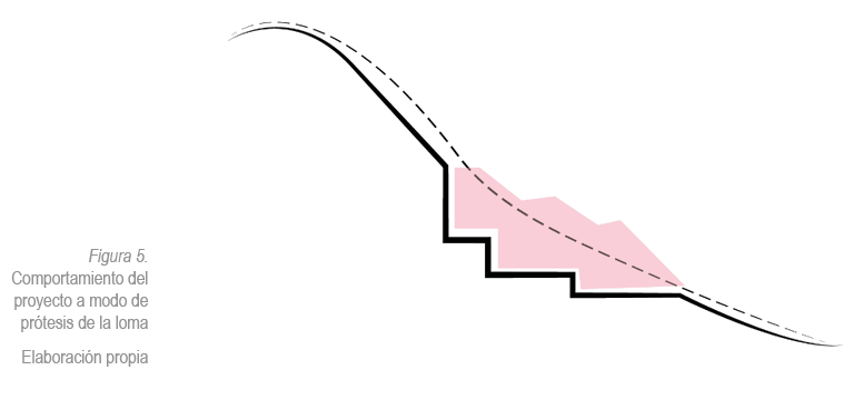 El proyecto se concibe como un ecotono2, es decir, su naturaleza es el resultado de la transición entre entornos contrastantes: las lomas y la trama urbana. No se establecen límites claros, lo que permite dejar de lado las dicotomías para entenderlo como una nueva entidad que surge, a partir de ambas realidades, y las vincula. Con base en un entendimiento geométrico del contexto, la intervención debe ser una prótesis para la loma, que busque regenerar el perfil natural perdido; por lo tanto, el proyecto no se mimetiza, camufla ni sobrepone al terreno.