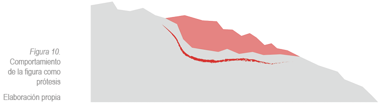 El volumen toca el suelo en su totalidad y se entiende como un elemento que pertenece al contexto, no se identifica como un intruso en el paisaje o un objeto sobrepuesto. Por lo tanto, la figura ayuda a completar la superficie dañada y manipulada por las invasiones a modo de prótesis.