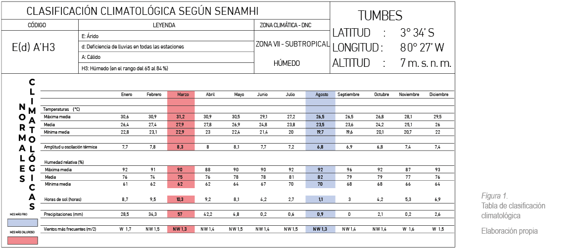 En la parte de información, la ficha contiene cinco cuadros. El primero muestra la clasificación climatológica según Senamhi, la ubicación geográfica de la zona y una tabla de normales climatológicas que engloba las variables de temperatura, precipitaciones, humedad relativa, horas de sol y vientos predominantes, y los compara con los doce meses del año (véase la figura 1). Este cuadro sirve para identificar el mes con la mayor y menor temperatura, considerando no solo los valores máximos y mínimos en grados centígrados, sino también las demás variables ya mencionadas. Por ejemplo, en nuestro caso de estudio, para la ciudad de Tumbes pudimos señalar a marzo como el mes más caluroso, no solo porque tenía la temperatura máxima media más alta y baja humedad, sino porque también contaba con la mayor cantidad de horas de sol. A primera vista, el mes más frío sería septiembre, porque tiene la temperatura mínima media más baja de todo el año; sin embargo, concluimos que agosto es el más frío porque presenta casi las mismas temperaturas, pero con mayor humedad y muchas menos horas de sol. Este es un ejemplo de la importancia de analizar todos los datos y no solo las temperaturas para identificar el mes con la mayor y menor temperatura.