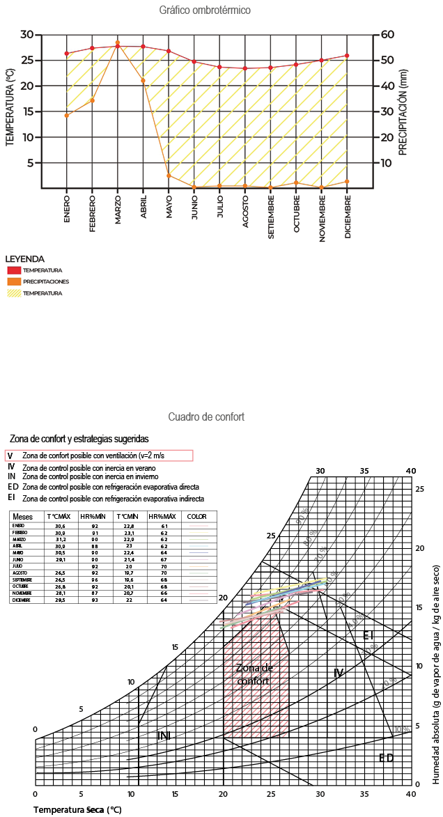 El gráfico de confort bioclimático de Givoni es quizás el más complejo, pero el que más ayuda para definir las estrategias de diseño para el proyecto. Este gráfico nos permite comparar temperatura seca, humedad absoluta y humedad relativa a lo largo del año para poder caracterizar el clima del lugar y conocer el grado de dificultad para resolver de forma pasiva las necesidades de confort térmico de las personas. El diagrama de Givoni cambia ligeramente según el clima general de la zona: para climas fríos, moderados y cálidos; en nuestro caso, elegimos el diagrama para climas cálidos por las altas temperaturas presentes en Tumbes. La información se coloca tal como detalla Wieser (2011):