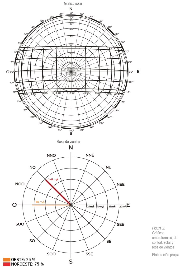 En el grafico de la rosa de vientos se coloca la velocidad, orientación y frecuencia del viento en la zona usando el promedio de todo el año. En nuestro caso, el viento llega desde el oeste por tres meses y del noroeste por nueve; la línea más gruesa del noroeste representa este 75 % de frecuencia. Esta información servirá para cuando definamos las estrategias de control pasivo.
