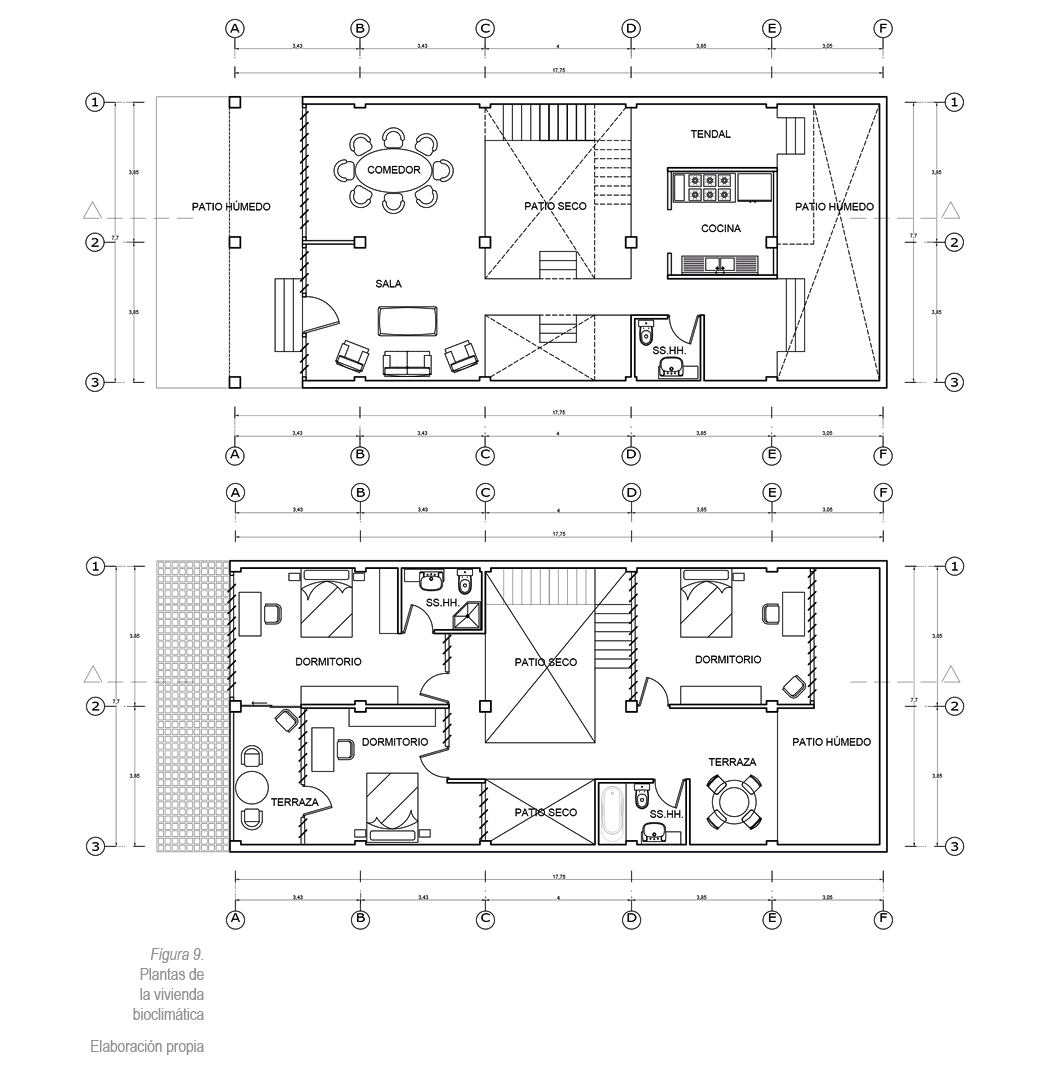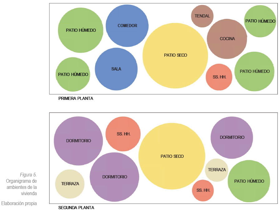 Con la información y los criterios obtenidos de la ficha bioclimática pasamos al diseño de la vivienda, teniendo siempre en cuenta las estrategias de control pasivo recomendadas y el buen funcionamiento de la vivienda por igual. Para garantizar el correcto funcionamiento de la vivienda como tal, el primer paso fue establecer un organigrama de los ambientes necesarios y su distribución en planta. En el primer nivel, el acceso es a través del primer patio húmedo hacia la sala, al lado del comedor. El patio seco central separa los ambientes más privados de cocina y lavandería, y el otro patio húmedo. En el segundo nivel, están distribuidos los tres dormitorios con dos baños y dos terrazas. Desde esta primera distribución se puede ver la importancia de las estrategias de control ambiental pasivo en el uso de diferentes tipos de patios. Los patios húmedos laterales enfrían y humedecen el aire que entra a la vivienda hasta llegar al patio seco; en este el aire se calienta y escapa de la vivienda hacia arriba. Esta salida de aire caliente genera un diferencial de presión, lo que mejora la ventilación en el interior del edificio.
