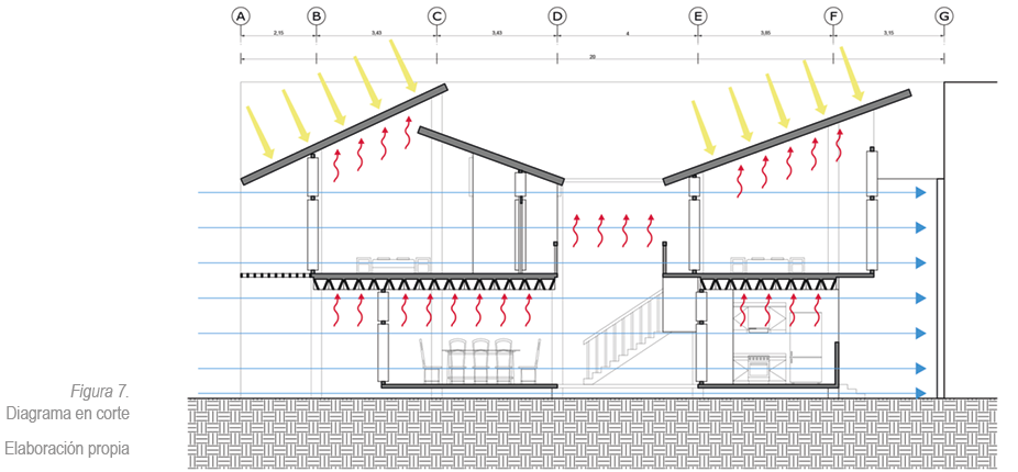Siguiendo las recomendaciones de diseño de la ficha bioclimática, en el corte del proyecto se pueden ver los aleros y celosía horizontal de madera en la fachada, que garantizan sombra al patio húmedo, a la sala-comedor y a la terraza de los dormitorios hasta las 3:30 p. m. Esto se logró realizando un análisis de incidencia solar en puntos tanto al interior como al exterior de la vivienda; para este estudio utilizamos el gráfico del recorrido solar colocado en la ficha bioclimática. Por ejemplo, el análisis del punto central del patio seco nos muestra que recibirá sol una hora entre las 12:00 y la 1:00 p. m. durante los solsticios y hasta cuatro horas durante los equinoccios. Con esta información podemos garantizar que el patio cumplirá su función de calentar el aire para que salga de la vivienda. En el corte también se nota la elevación del piso del primer nivel para permitir la circulación de aire bajo este para reducir las temperaturas al interior. En el segundo nivel, los techos altos y en diagonal usan principios del efecto chimenea y de la cámara solar para extraer el aire caliente del ambiente y promover la circulación de aire fresco al interior. Al calentarse la losa de los techos, se genera una zona de aire caliente que escapa rápidamente por las aberturas en la parte más alta del ambiente.