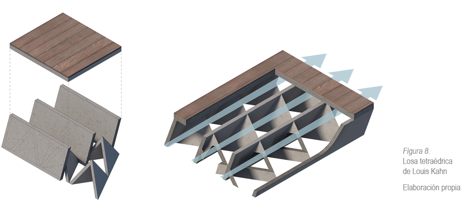 La estrategia utilizada en el nivel superior no es tan fácil de aplicar en el primer nivel, debido a que la losa del segundo nivel debe ser plana; sin embargo, planteamos el uso de una losa prefabricada que facilita la extracción del aire caliente de los ambientes del primer nivel. La losa diseñada por Louis Kahn para la galería de arte de la Universidad de Yale está compuesta por planos inclinados apoyados en tetraedros. Originalmente, el vacío que se crea entre la parte superior de la losa y los tetraedros estaba destinado para las instalaciones eléctricas, sanitarias y ductos de ventilación. En nuestro caso, orientar este vacío hacia el exterior permitiría el ingreso del viento a través de la losa y lo aceleraría, por el efecto Venturi, facilitando que empuje hacia los patios el aire caliente que haya subido hacia la losa.