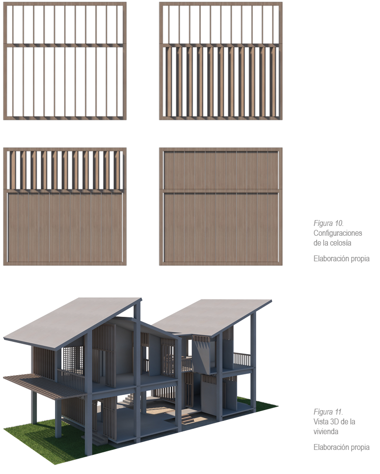Para los cerramientos planteamos no usar muros, sino celosías móviles de dos cuerpos que podrían configurarse según la necesidad del usuario en determinado momento. Con ambos cuerpos abiertos se permite el ingreso de luz y viento; el cuerpo inferior semicerrado y el superior abierto permite una buena ventilación e iluminación, pero disminuye la incidencia de luz solar directa y aumenta la privacidad; con el cuerpo inferior totalmente cerrado y el superior semicerrado, se permite la ventilación en caso de fuertes lluvias o para mayor privacidad; y ambos cuerpos cerrados, para máxima privacidad y seguridad por las noches o cuando se requiera. Este sistema permite que el viento atraviese la vivienda de lado a lado pasando por las habitaciones sin comprometer totalmente la privacidad de sus usuarios. Por ejemplo, cuando una habitación está vacía, las celosías en su configuración abierta permiten el paso libre del viento; si alguien las usa, cerrar o semicerrar el cuerpo inferior le da privacidad al usuario sin perjudicar la ventilación del resto de ambientes.