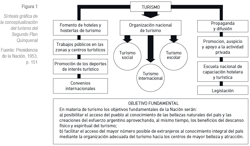 La concepción del turismo nacional, según los lineamientos del Primer Plan Quinquenal, tenía una faz económica y otra social: la económica se vinculaba con la posibilidad de acceder a hoteles baratos, por una parte, y de poder desplazarse a los sitios de veraneo a través de transportes acordes y con precios controlados, por otra. La faz social se derivaba del intercambio beneficioso entre turistas provenientes de distintas latitudes de la geografía nacional: a través del conocimiento del otro se reconocía la propia identidad y se reforzaba el sentido de pertenencia. El escenario propuesto para este intercambio eran las colonias de vacaciones y los campamentos (Presidencia de la Nación, 1946).
