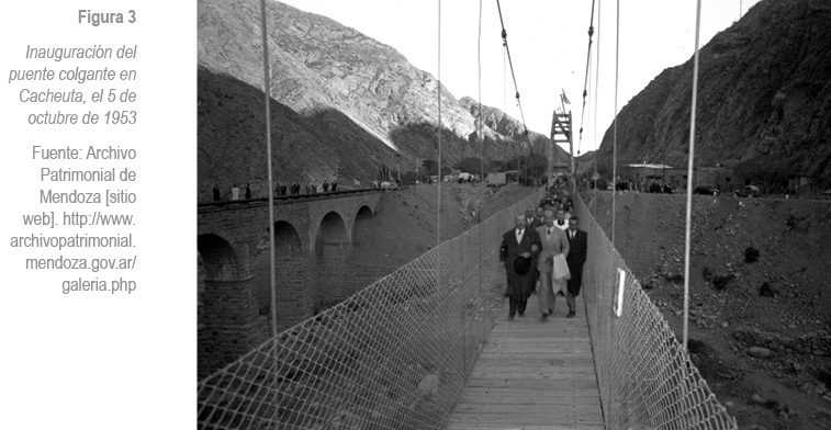 La última acción consistió en tender una pasarela peatonal, conocida popularmente como “puente colgante” en la localidad de Cacheuta, paralela al puente ferroviario del tren trasandino. La pasarela unía el sector de la antigua estación con el promontorio Norte, donde se ubicaban la escuela y el cementerio del poblado. El puente, de 112 m de longitud, fue desarrollado en tres tramos: con 1,6 m de ancho, cruzaba a una altura de 15 m sobre el río Mendoza. La obra costó $ 172 553 m/n y fue inaugurada en 1953 (véase la Figura 3).