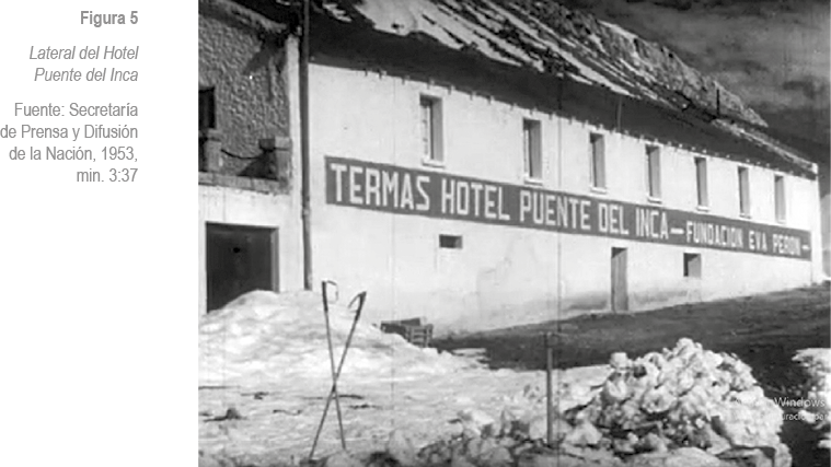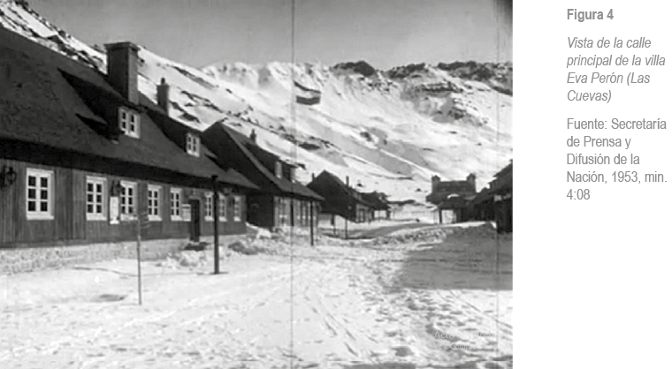 En favor de la difusión de la FEP y de su obra turística operaron también los documentales publicitarios de la Secretaría de Prensa y Difusión de la Nación. Porque amó a su pueblo fue el documental que narraba la obra de la FEP en el país y, en relación con el turismo de invierno, en Mendoza. Al momento de mostrar imágenes sobre el Hotel Puente del Inca, la voz en off del locutor narraba: “Hoteles de turismo social se multiplican en todos los centros de descanso. Allí, donde es más singular la hermosura de nuestra tierra” (Secretaría de Prensa, 1953, min. 3:35-3:36). Al mostrar imágenes de la villa Eva Perón, afirmaba: “En el límite demarcatorio con la nación hermana de Chile”, la villa es “una realidad que parecía irrealizable” (min. 4:05-4:06) (véanse las Figuras 4 y 5).