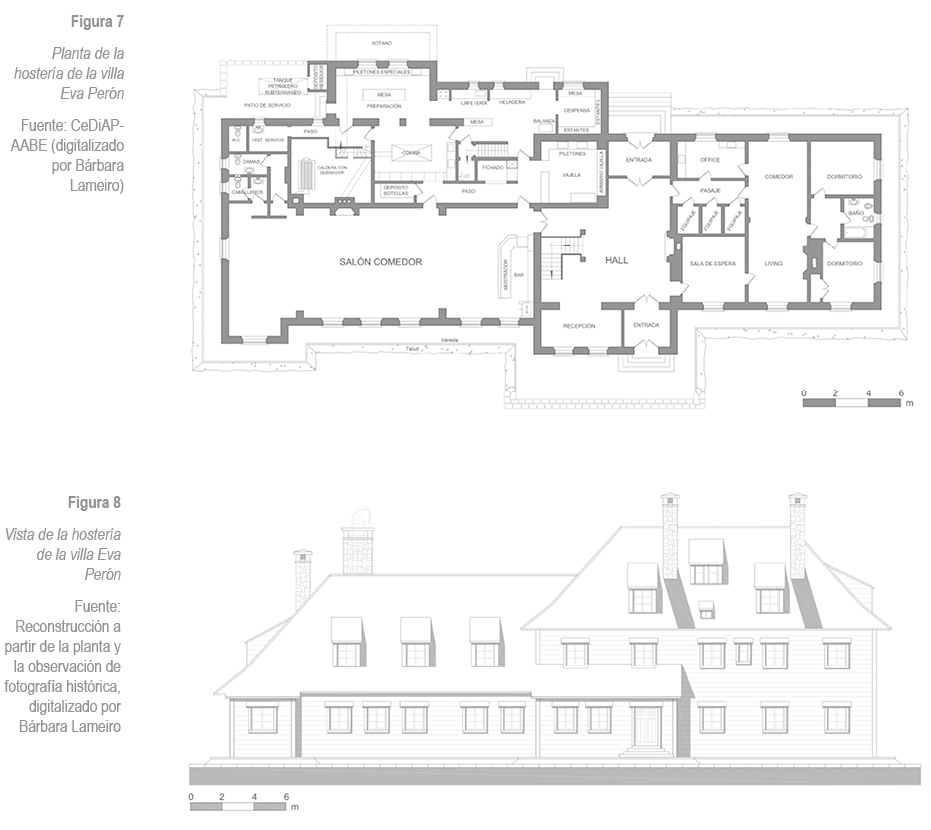 La hostería ocupó un lugar preponderante en la composición, enfrentada con la plaza principal y de mayor tamaño que el resto de las edificaciones. Fue resuelta en el mismo lenguaje y se organizó en un partido alargado, paralelo a la ruta, desarrollado en planta baja y un piso alto, con una buhardilla (véase la Figura 7). Ofrecía 20 habitaciones y 11 baños (Asociación de Hoteles…, 1958, p. 43). La planta baja concedió gran preponderancia a las zonas sociales, con el acceso y hall casi en el eje del edificio y, junto con el salón comedor, ocupando la mayor superficie. La vinculación visual con la ruta se hacía por medio de pequeñas ventanas alineadas, atendiendo la orientación sur de la fachada principal (una orientación desfavorable por la presencia de fuertes vientos cordilleranos).