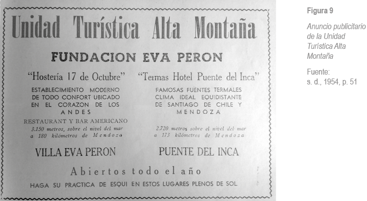 El 26 de febrero de 1953 quedaba oficialmente inaugurada la Unidad Turística de Alta Montaña (Stawski, 2005) de la Fundación Eva Perón (FEP)14. La fecha corresponde, en realidad, a la inauguración de la villa Eva Perón (a 3557 msnm) y significó el primer paso del proceso que buscaba visibilizar los productos turísticos del área de frontera, como parte de un mismo proyecto de difusión15. Estos productos incluían al Hotel Termal Puente del Inca, que había pasado a manos del Estado, y la hostería de la villa Eva Perón. En Agua, Vivienda, Salud figuraba: