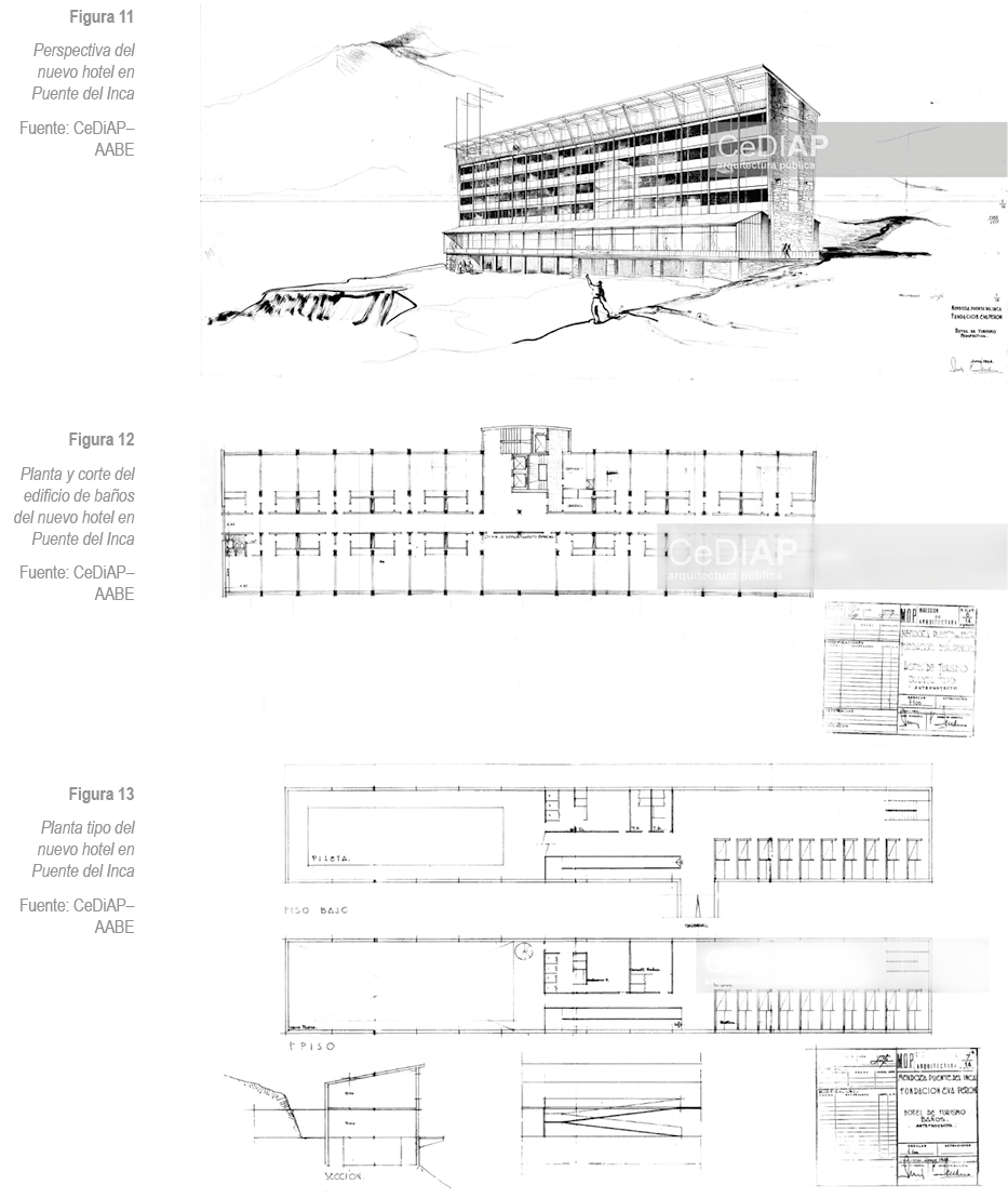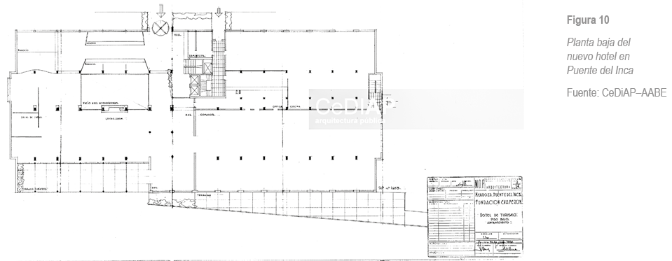 Es posible que el auge de los parajes de la cordillera (y la notable mejora operada en la villa Eva Perón) justificara una intervención en Puente del Inca, un lugar que se había instituido como un destino tradicional del turismo termal de los círculos aristocráticos y, a partir de 1930, de los deportes de montaña. Entre enero y febrero de 1954, se realizó un levantamiento planialtimétrico en la zona del hotel, con el objeto de construir un nuevo edificio. Si bien la intención avanzó hasta la fase de anteproyecto (el edificio no llegó a concretarse), la acción es elocuente respecto de la resignificación de los antiguos destinos, pero vinculados ahora a los “nuevos” propósitos del turismo masivo.