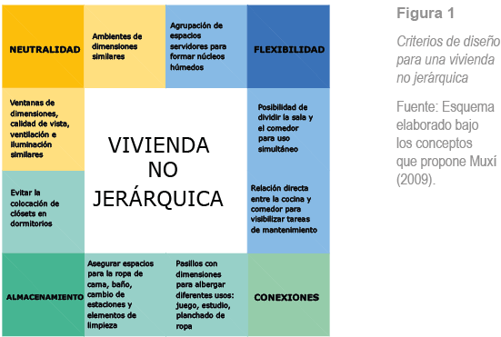Finalmente, hace mención de las conexiones (pasadizos). Muxí (2009) cuestiona que estas tengan la única función de comunicar un lugar con otro y propone establecer funciones en ellas para juegos, para labores domésticas —como el planchado de la ropa— o para espacios de estudio; sin embargo, para ello, estas deberán cumplir con las correctas condiciones de iluminación y ventilación. En la Figura 1, se reúnen los aspectos antes mencionados y que han sido utilizados para determinar si es que la vivienda residencial contemporánea de la ciudad de Lima presenta las características de una vivienda no jerárquica.