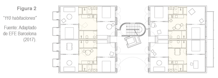 Los conceptos antes explicados ya han sido puestos en práctica en diferentes proyectos de viviendas multifamiliares en España. Un ejemplo es el proyecto diseñado por el estudio MAIO (2017) llamado “110 habitaciones”, ubicado en Barcelona. Este proyecto de veintidós viviendas presenta habitaciones regulares, característica que rescata MAIO de las viviendas de fines del s. xix inscritas en el Eixample (Ensanche) de Idelfons Cerdá. En este diseño, la cocina está ubicada al centro de la vivienda y es el espacio que articula y conecta las otras cuatro habitaciones de dimensiones similares que conforman la unidad habitacional. Gracias a esta configuración, no existen los pasillos ni jerarquías entre los ambientes (véase la Figura 2)6 (EFE Barcelona, 2017).