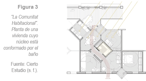 El diseño de estas viviendas presenta en su núcleo el baño, que es el espacio articulador por el cual se accede a las otras habitaciones, todas de tamaño similar (véase la Figura 3). Además, otro elemento a rescatar de este diseño es el espacio intermedio que presenta al ingreso de cada unidad, lo que posibilita el encuentro y reunión de los vecinos para fomentar la vida en comunidad. Estos dos ejemplos, así como otros, evidencian la viabilidad para aplicar las recomendaciones de diseño, propuestas por Muxí (2009), desde una perspectiva feminista.