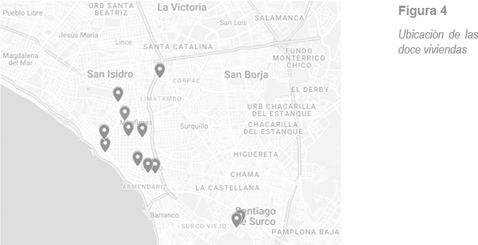 Bajo el estudio de las características y recomendaciones para una vivienda no jerárquica ni androcéntrica propuesto por Muxí (2009), se realizó el análisis de doce viviendas que ofertaban, en el mercado peruano, diferentes inmobiliarias en diciembre del 2020, ubicadas en los distritos de Miraflores, San Isidro y Surco (véase la Figura 4). El estudio utiliza como metodología el redibujo de los planos de estas viviendas, obtenidos de las páginas web de las inmobiliarias, para identificar las dimensiones de los diferentes espacios que conforman el programa arquitectónico y las relaciones de ubicación o zonificación de los espacios de cuidado y descanso. Para, con ello, concluir sobre las dinámicas y relaciones que pueden surgir al habitar una vivienda de este tipo.
