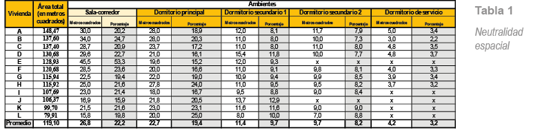 El primer aspecto llevado al análisis es la neutralidad espacial. En la Tabla 1 se han clasificado y ordenado los ambientes de las viviendas que han sido analizados bajo este criterio: la sala-comedor, el dormitorio principal, los dormitorios secundarios y el dormitorio de servicio. A través del cálculo de las áreas de cada uno de estos espacios, se han obtenido los valores (en porcentaje) de las superficies que representa cada espacio del área total de la vivienda. La variedad y diferencias en las áreas evidencia una jerarquización de los espacios y sus usuarios. El promedio de los doce casos sugiere que la sala-comedor presenta una diferencia superior a dos puntos porcentuales respecto del área destinada al dormitorio principal. En este caso, la diferencia no es significativa. Por el contrario, la mayor diferencia se da cuando se comparan las áreas de los dormitorios principales con los secundarios, que en la mitad de los casos, los primeros superan con el doble del área a los segundos. Lo que no quiere decir que en los otros casos la superficie ocupada por los dormitorios principales no sea mayor. En todos los casos sucede de esta manera.