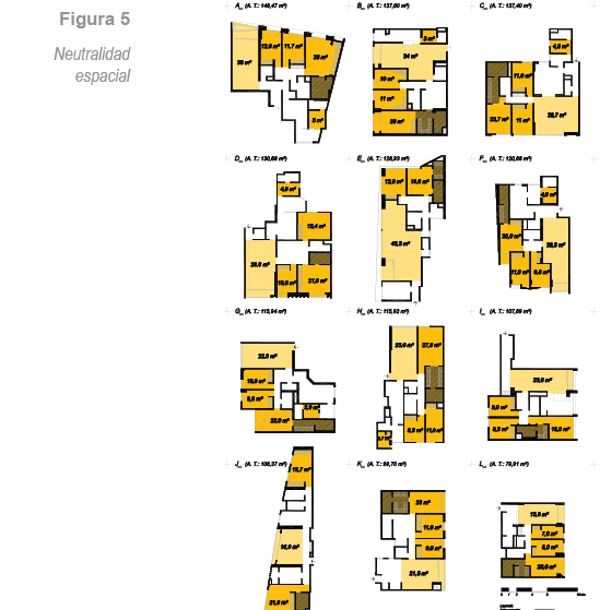 En primer lugar, se comentarán los resultados de manera general para luego proceder a explicar cada uno de los aspectos llevados al análisis: neutralidad, flexibilidad, almacenamiento y conexiones. Las doce viviendas carecen de neutralidad espacial. Las dimensiones de las habitaciones destinadas a los dormitorios, en todas sus versiones —principal, secundario y de servicio—, así como el espacio social sala-comedor, presentan claras y evidentes diferencias formales. De la misma manera, se puede argumentar que las doce viviendas no contemplan las características de la flexibilidad en sus diseños. En la mayoría de casos, los espacios húmedos no están agrupados, sino se encuentran dispersos, lo que dificulta una futura reorganización espacial.