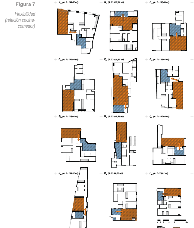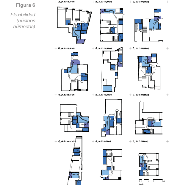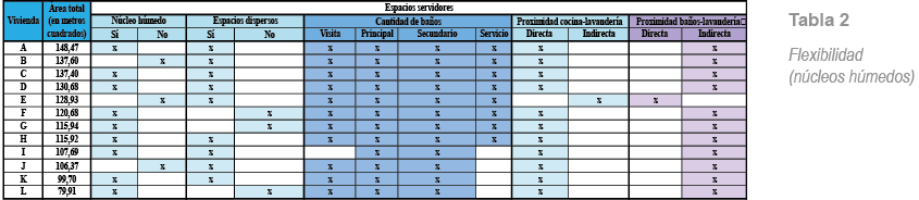 En cuanto a la flexibilidad, esta se evidencia por la agrupación, en núcleos, de los espacios húmedos o servidores: cocina, lavandería y baños. En la mayoría de los casos de estudio, estos espacios no se encuentran centralizados en núcleos para permitir cambios significativos en un futuro. Por el contrario, están repartidos indistintamente por toda la vivienda.