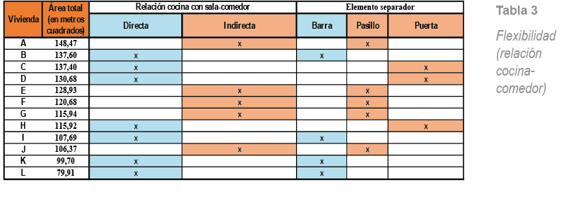 Otro aspecto analizado en cuanto a la característica de flexibilidad es la opción de cambio de función de los espacios servidos. En particular, en el caso de la sala-comedor, se evidencia que estas viviendas no presentan la opción de utilizar la sala y el comedor de manera separada y en simultáneo para realizar actividades diversas, como puede ser estudio, trabajo y ocio, debido a que comparten un mismo ambiente. De la misma manera, la relación cocina-comedor no es directa. En la Tabla 3 se ha elaborado una clasificación sobre las maneras en que estos dos espacios de la vivienda están relacionados, si es de forma directa o indirecta. Además, se indica a través de qué elemento se genera la relación o separación, ya sea a través de una barra, una puerta o un pasillo respectivamente.