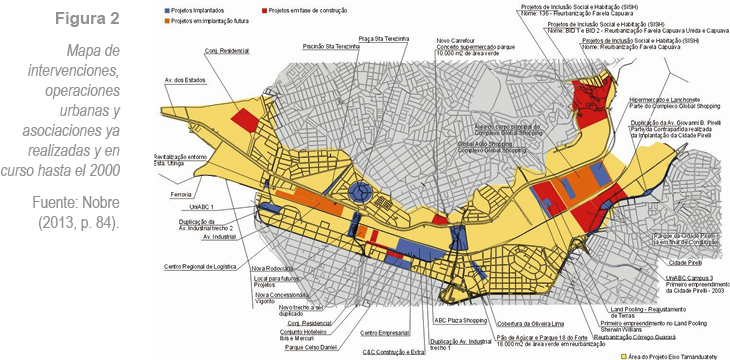 De estas experiencias nació el proyecto de intervención urbana Eixo Tamanduatehy en el municipio de Santo André, implantado entre 1997 y 2004 (Teixeira, 2010), el cual tuvo como objetivo recalificar los espacios antes ocupados por las industrias fordistas y transformar así las antiguas bodegas en áreas comerciales, plazas comerciales, iglesias, universidades, entre otros, como se puede observar en la Figura 2.