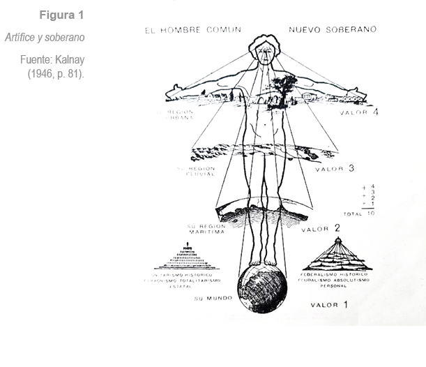 En el artículo referido más arriba, “Vivir y habitar. Contribución al estudio del problema de la vivienda”, en el apartado IV, titulado “Artífice y soberano”, Jorge Kalnay ilustró, con una imagen que el propio autor señaló que fue publicada al dorso del primer boletín del PINOA (véase la Figura 1), su concepción de la relación del hombre con su región y la explicó. La imagen es concebida por Kalnay, en los meses que siguieron a la Primera Guerra Mundial, como símbolo de la reestructuración política de la región danubiana y su incorporación a la Liga de las Naciones. En ella, procuró simbolizar la búsqueda, en la dignificación de la persona y en la jerarquización del gobierno vecinal y su extensión, el hecho de unir y confederar políticamente a los pueblos obligados por la naturaleza a convivir e intercambiar productos y servicios, ideas y sentimientos. Los valores numéricos fijados al margen de la figura constituyen una guía de jerarquización del poder administrativo y de la función impositiva. La representación humana asociada a la organización territorial y política, con la región urbana en primer lugar y con mayor valencia, indica no solamente el posicionamiento ante lo regional, sino también ante las cuestiones de organización territorial general.