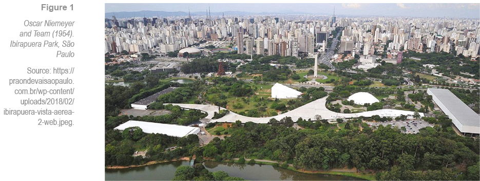 The modernizing aspirations in the architecture of the Ibirapuera Park (Figure 1) by Oscar Niemeyer and team1 (1951–1954) point to the contradictions inherent in Brazil’s modernization process. As part of the celebrations of the IV Centennial of the City of São Paulo, which took place in 1954, the Ibirapuera Park project was intended to become an emblem of São Paulo’s rise and Brazil’s transition from an agricultural condition to a new industrial vocation. An emblem, indeed, of its projection as a country effectively participating in the world’s political and cultural scene.