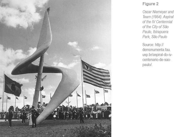This rhetoric of grandeur has a touch of passionate utopianism, very typical of that period’s attempt at overcoming the traumas of underdevelopment. This can be symbolized, for example, in the episode involving one of the most iconic installations in the original project for the Park, which was eventually built: the Aspiral, which—as the name suggests—combined the “aspiration” for a modern São Paulo with the form of an ascending “spiral”: a monument made of jute and plaster covering an iron frame (Figure 2).
