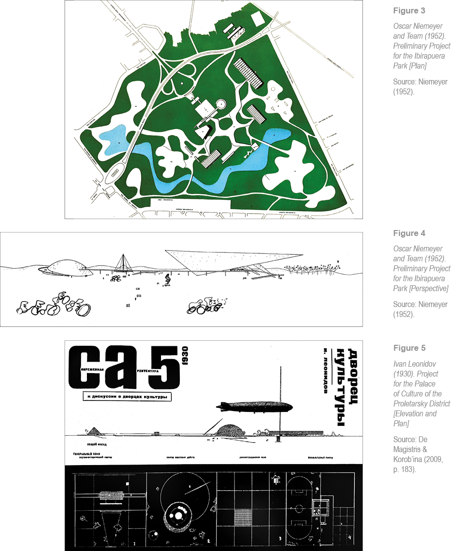 This subject requires in-depth studies, being briefly mentioned by a few sources. In an interview with Costa (2022), Paulo Mendes da Rocha quickly commented on the fact that the design of the Ibirapuera Park cited elements from a project by Leonidov, and Gurian (2014) showed a juxtaposition of drawings from these two projects.3 However, no study was carried out that deeply researched Niemeyer’s use of the Russian avant-garde. This is what we intend to prove in this article. In our hypothesis, more than a citation of architectural forms or compositional similarities, Niemeyer’s dialogue with Leonidov’s work takes place at the level of conception of space. In this sense, we can read in Niemeyer’s work a fundamental reflection on the modern condition.