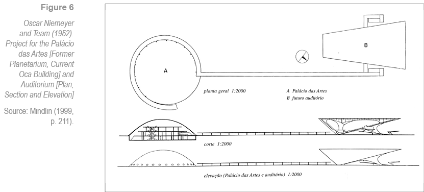 5 Almost in a retroactive gesture, a smaller planetarium was added to the project and built in 1957 with characteristics similar to the previous idea of the Palácio das Artes. The auditorium originally had an internal capacity for 3,000 people, but the built version holds only 800 (Niemeyer,