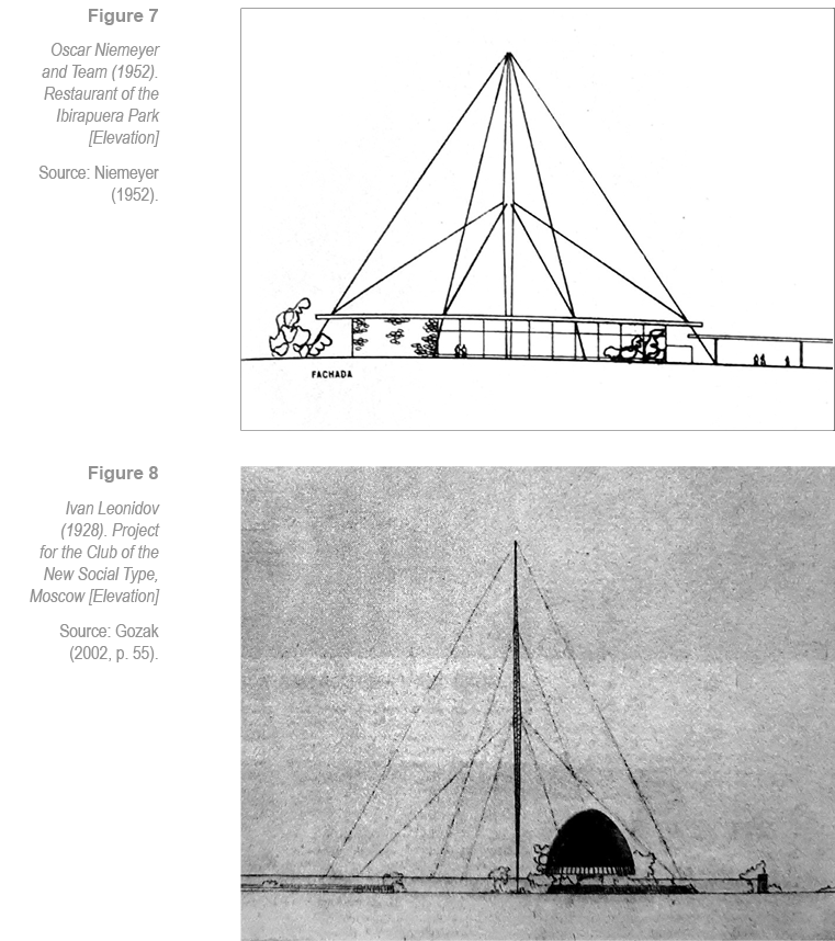 Niemeyer refers to another one of Leonidov’s projects in the preliminary design of the Ibirapuera Park. The design of the restaurant, whose square roof would be suspended by rods connected to a central mast, is a practically literal transposition of a structure found in the project for the Club of the New Social Type, from 1928 (Figures 7 and 8).