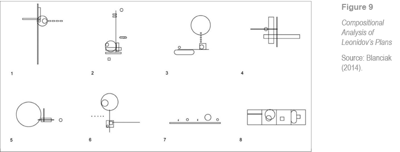 This compositional strategy, by “avoiding the notion of center,” leads to a rupture or a “disorder” of the classical composition, structured from a center and with symmetrical relationships, as observed by Blanciak (2014). The abolition of the traditional tsarist order and the break with a feudal structure would allow the emergence of a new and dynamic revolutionary society: a context in which to conceive an architecture that operates through a “dynamic composition, as one that is the result of a movement” would only make sense (Blanciak, 2014, p. 138).