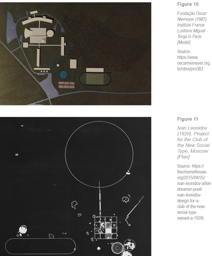 This decentering of volumes spread across a space also operates in the Ibirapuera Park and across Niemeyer’s work as a whole.12 This includes the design of the Institute France Lusitane Miguel Torga in Paris from the 1980s (Figure 10), in which the architect created in the plan a similar “dialogue” between the circle and another geometric volume—a restaurant and an auditorium, respectively—to the one present in the Ibirapuera Park.13 In effect, this project by Niemeyer looks like a kind of edited version without the large marquee of the Ibirapuera Park, with its space full of scattered geometric volumes. Also, the Institute France demonstrates strong similarities with Leonidov’s compositions, in particular the blueprint for the Club of the New Social Type (Figure 11). The asymmetrical arrangement of circular shapes, grids of rectangles, linear axes indicating marquees and, most notably, the iconic oblong shape representing a sports court, contribute to our understanding that the Brazilian architect based his design decisions on spatial, formal and compositional resources originating from the Russian avant-garde.