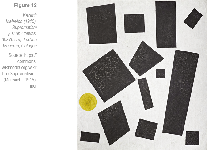 Instead of a portrait or still life representation, the viewer of a suprematist work is shocked by the mere (and disconcerting, even hideous) presence of a black square on an empty, white background. In other cases, Malevich would fill this neutral background with geometric shapes (Figure 12).14 Imagining an art that gave up on the representation of objects was a challenge to the entire figurative artistic tradition based on a tabula rasa typical of modernist discourse. But the desire to make art and life restart from new bases is linked, in the case of Malevich and Leonidov, to the historical concreteness of profound political and social transformations.15 To make art begin anew, there is nothing fairer than starting the paintings from a white canvas.