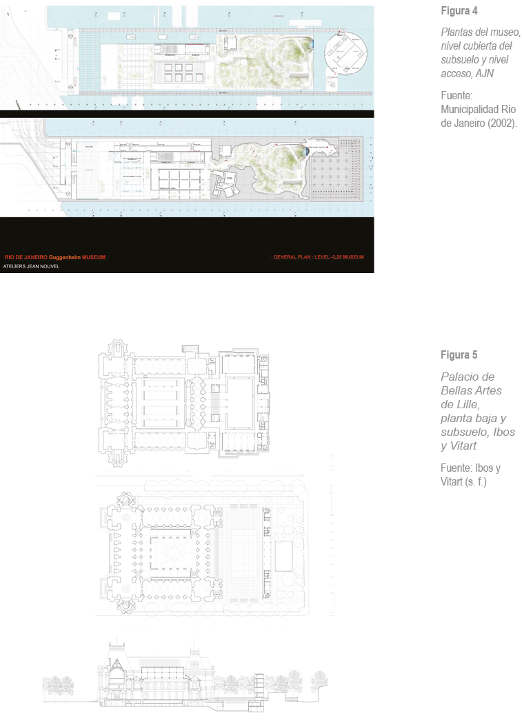 Observamos la fluidez en la circulación y la continuidad entre la ciudad y el territorio a través de efectos de los materiales utilizados y de la ubicación de los proyectos estudiados. Son anticipaciones del debate contemporáneo, en el que se encuentran títulos como “Envolventes horizontales” de Zaera-Polo, “Vectores y envolventes” de Tschumi y “Envolventes como mediación” de Hays. Los diseños del arquitecto Jean Nouvel (véase la Figura 2) para la Mediateca de Nîmes (1984) y de Ibos y Vitart (véase la Figura 5) para el Palacio de Bellas Artes de Lille (1992) se insertan bajo tierra de forma que nos permite aproximarlos al proyecto no construido de Nouvel para el Museo Guggenheim, en Río de Janeiro (véase la Figura 4).