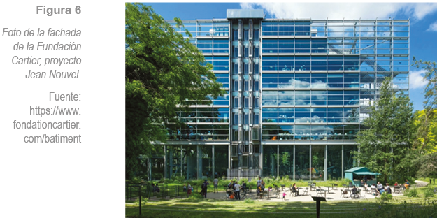 En la Fundación Cartier (1991-1994), construida en 1994, Nouvel superpone capas de vidrios. Las sucesivas estructuras metálicas vidriadas provocan reflejos y transparencias en las fachadas, a las que se suman las siluetas de los árboles del sitio (véase la Figura 6).