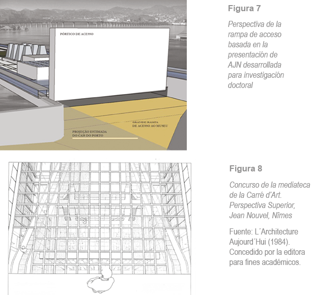 En el concurso de la mediateca Carré d’Art de Nîmes (1984), surgen ideas embrionarias para la cobertura del Guggenheim Río (véase la figura 8). Sería un edificio subterráneo bajo la plaza pública, lo que evitaría la proximidad al patrimonio histórico existente. La interfaz entre interior y exterior se establecería mediante un espejo de agua, que llevaría iluminación al interior de la mediateca subterránea y mantendría la distancia necesaria para despejar la vista del templo romano Maison Carré. Las rampas de acceso y el ambiente con luz cenital contribuyen a la familiaridad entre los proyectos de Río y Nîmes (véanse las figuras 7 y 8). Se reafirma la noción de pantalla “entre dos mundos independientes”, mencionada por Scoffier, en el paso de la luz y el efecto del agua en movimiento.