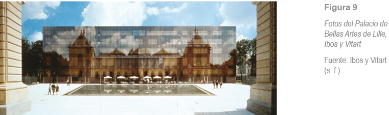 Otro edificio que deliberadamente confunde la vista es resultado del concurso para el Palacio de Bellas Artes de Lille (véase la figura 9), en Francia (1990-1997). El proyecto de Ibos y Vitart se desarrolló para un edificio construido en el siglo xix, que quedó sin terminar. En lugar de terminar el edificio, los arquitectos prefirieron dejarlo como estaba y construir una caja de vidrio independiente en el borde del terreno, conectada al antiguo edificio por una sala de exhibición subterránea (véase la figura 5).