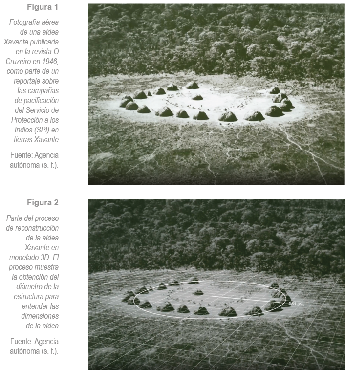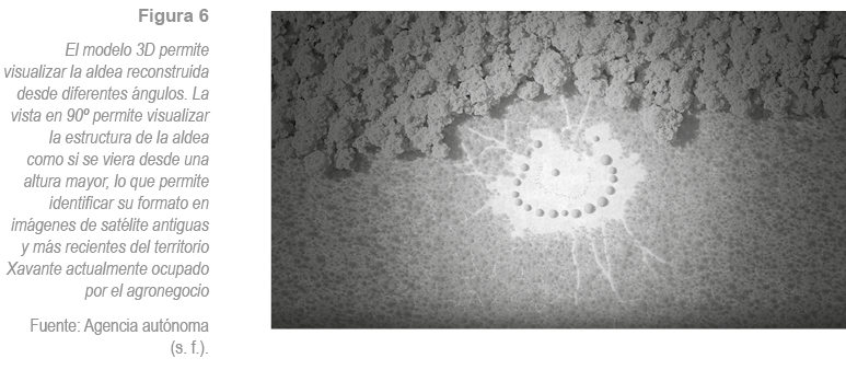 El campo de la investigación estuvo compuesto por fotografías aéreas de las décadas de 1940 a 1970, a partir de las cuales fue posible identificar algunas aldeas importantes del territorio Xavante. Además, se realizó un extenso trabajo de campo con ancianos de este pueblo para la comprensión de las aldeas en su formato y elementos arquitectónicos característicos, lo que permitió la identificación de un patrón geométrico: el formato en arco hacia una fuente de agua, un espacio central como foro social y político, y una aldea más alejada, dedicada a los jóvenes en iniciación. Las figuras 1 al 6 ilustran el proceso de reconstrucción de una aldea Xavante en modelado 3D con base en una fotografía aérea. El modelo, posteriormente, pudo ser estudiado y utilizado para la identificación de antiguas aldeas en imágenes de satélite de la época y también más recientes.