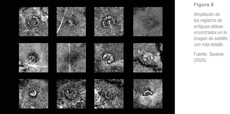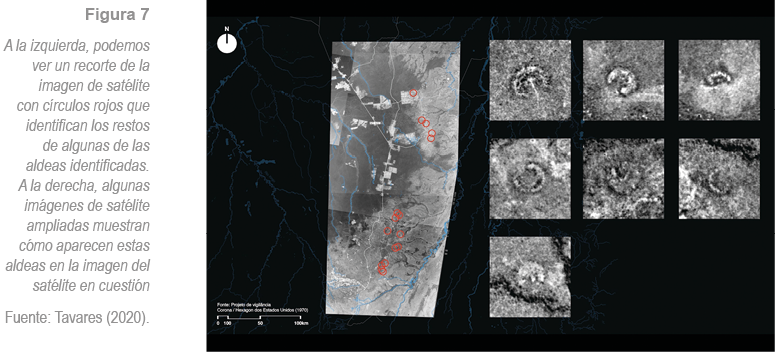 El trabajo de modelado 3D de estas aldeas permitió definir con mayor precisión sus dimensiones y características espaciales, ya que, a partir del modelo, es posible ver la aldea y su forma desde diferentes ángulos. El siguiente paso fue el análisis de imágenes de satélite contemporáneas a la época en que se tomaron las fotos, lo que permitió el reconocimiento de inscripciones en la tierra que correspondían a la forma de las aldeas y el mapeo de los antiguos pueblos Xavante. Posteriormente, a partir de las coordenadas obtenidas por las imágenes de satélite, fue posible sincronizar los datos encontrados con la propia historia oral y memoria Xavante, y posicionar cada aldea ubicada en un complejo arqueológico Xavante, de modo que se comprobó su ocupación en esta región a través de las inscripciones grabadas en la tierra, es decir, a través de la memoria que la forma de vida Xavante grabó en el bosque. Las figuras 7 y 8 ilustran el proceso de reconocimiento e identificación de los vestigios de las antiguas aldeas en las imágenes de satélite.