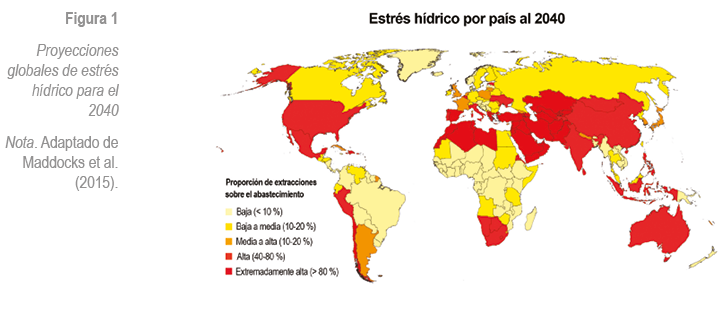 En el 2020, la extracción total de agua dulce fue de 3 895 000 km3 (Banco Mundial, 2020). Actualmente, la agricultura representa el 69 % del consumo de agua a nivel mundial, seguida por la industria con el 19 %, mientras el 12 % corresponde a uso municipal (UN-Water, 2021). Sin embargo, en los últimos cuarenta años, el consumo global de agua ha aumentado 1 % anual y se espera que la demanda crezca al mismo ritmo hasta el 2050, lo que representará un incremento de 30 % por encima del nivel actual, debido principalmente al crecimiento de la demanda en los sectores municipal e industrial (UN-Water, 2019). De continuar con la tendencia de sobreexplotación del agua, es muy probable que en las próximas décadas se experimenten escenarios de estrés hídrico en varias regiones del mundo. En la Figura 1, se muestra la proyección de los países con mayor índice de estrés hídrico para el 2040, entre ellos, están países latinoamericanos como México, Perú, Chile y Ecuador.